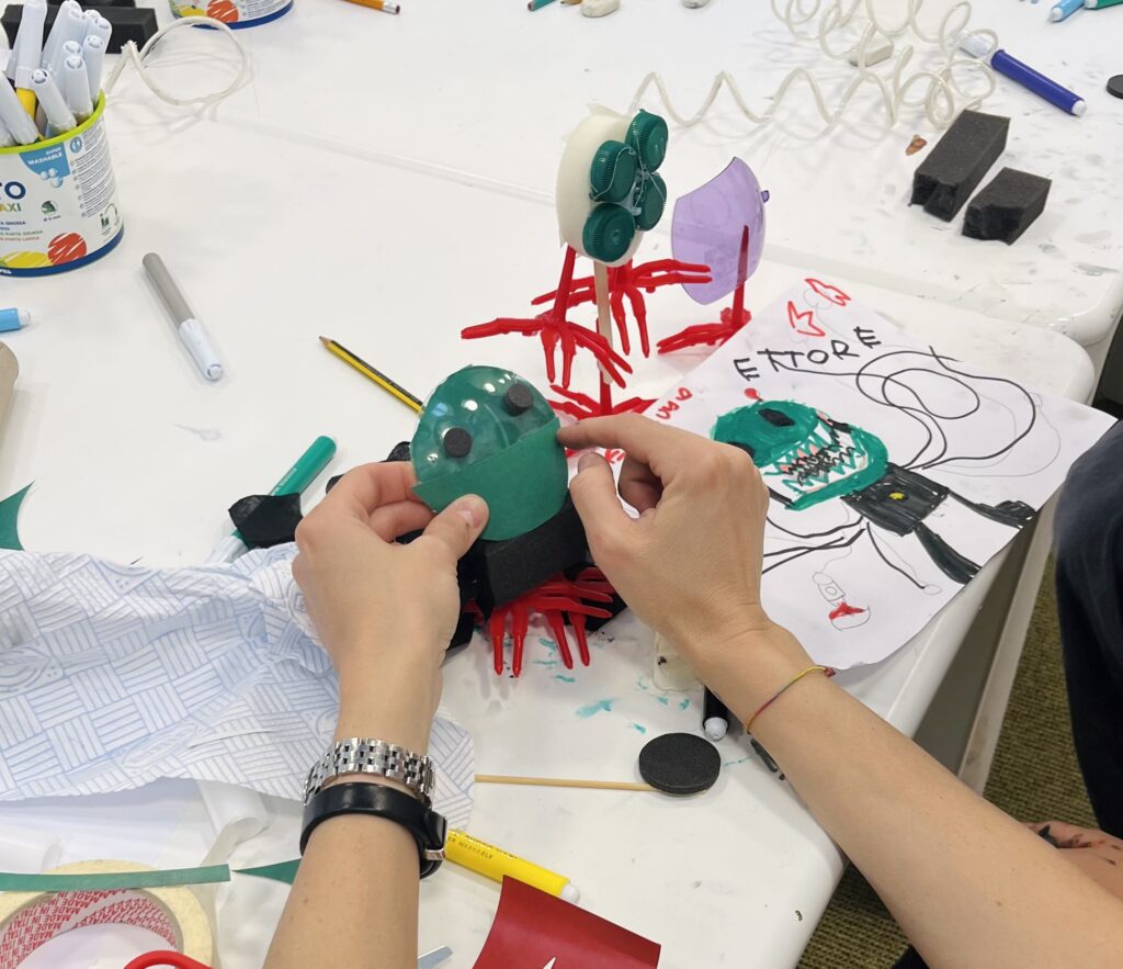 - Immaginare è la parte più creativa: qui i bambini danno libero sfogo alla loro immaginazione, sperimentando e proponendo le loro idee originali. L’obiettivo non è creare un risultato perfetto, ma esplorare più possibilità, senza paura di osare. È qui che nasce il “punto di vista nuovo” e in questa fase la guida delle educatrici del Junior Design Lab è fondamentale nell’aiutare i bambini a ragionare in autonomia.